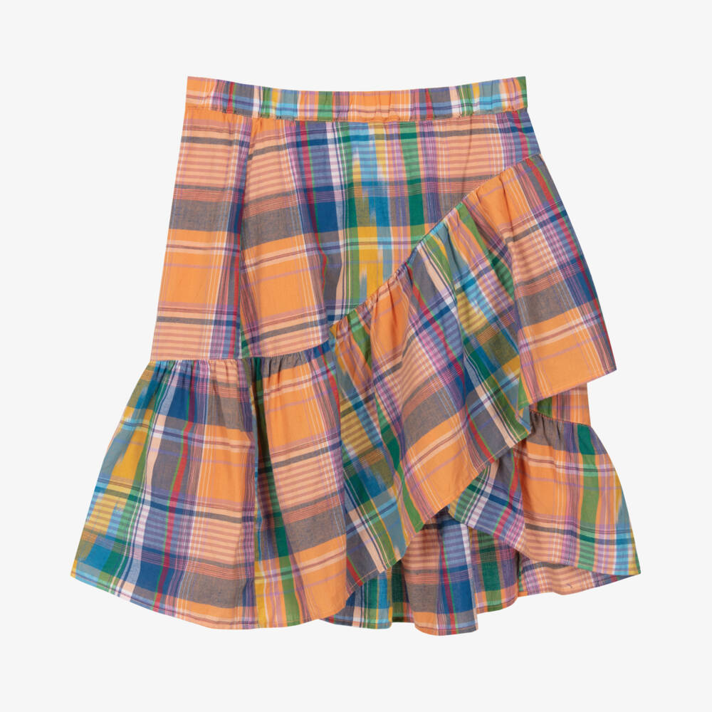 Casual and comfortable for teen girls, a lovely tiered, layered skirt by Molo. It is made in lightweight cotton, in a blue, orange, purple and green checked pattern. Fully lined for comfort, it fastens discreetly with a concealed zip on the back. There is an elasticated waist for a good fit, with a branded tab on the side seam for a designer touch.