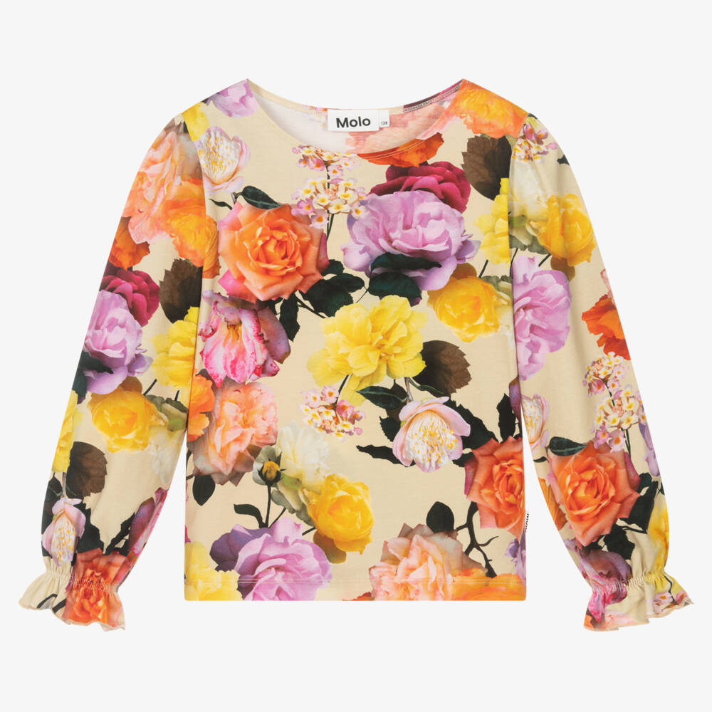 Beige long-sleeved top for teen girls by Danish brand Molo, with a colourful floral print in pink, yellow and orange. A casual style with a statement look, it is made in comfortable organic cotton jersey and has puffed sleeves with elasticated, ruffled cuffs. For a designer finish, it has a branded logo tab on the side seam.