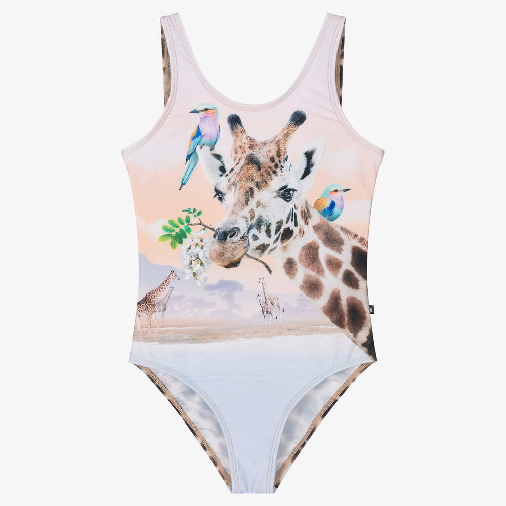 Eye-catching swimsuit for teen girls by Molo, with a giraffe design in shades of pink, beige and blue. Silky smooth and stretchy, this classic style is made in recycled fabric with UPF50+. It is fully lined for added comfort and modesty.