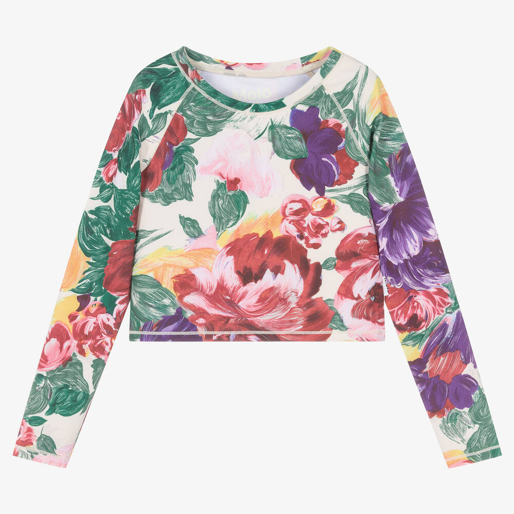 A vibrant sports top for teen girls by Molo, in a colourful floral print against an ivory background. Great for exercise, it is made in silky smooth jersey with a smart temperature regulating feature that helps the body to cool down and keep comfortable. Designed to sit on the waist, it has long raglan sleeves with soft overlock stitching on the seams. A logo tab can be seen on the side for a subtly branded vibe.