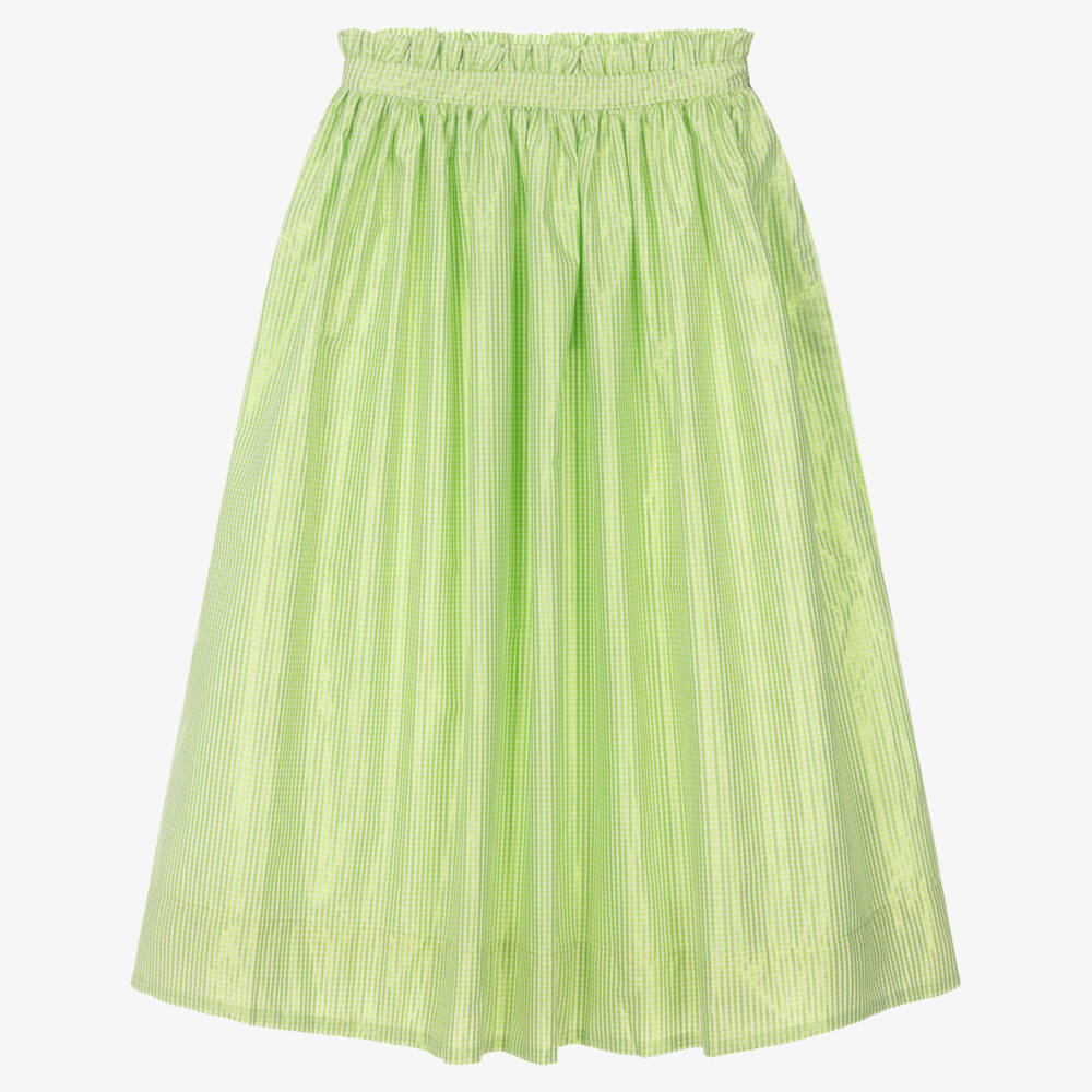 Teen girls green gingham midi skirt, by Danish brand Molo. Featuring a subtle logo tab on one side, it has a summery gingham print with a metallic shimmer. It has an on-trend paper bag-style waist and a concealed zip on the side for functionality.