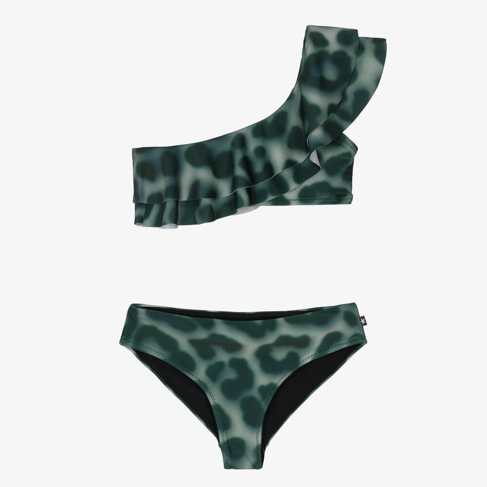 A stylish green bikini for teen girls from Danish brand Molo, in an abstract jaguar print. This silky smooth bikini is designed with one shoulder strap with a layered ruffle for modern, asymmetrical style. With a sun protective factor of UPF 50+, both pieces are fully lined for comfort and modesty. This item is made with recycled material.