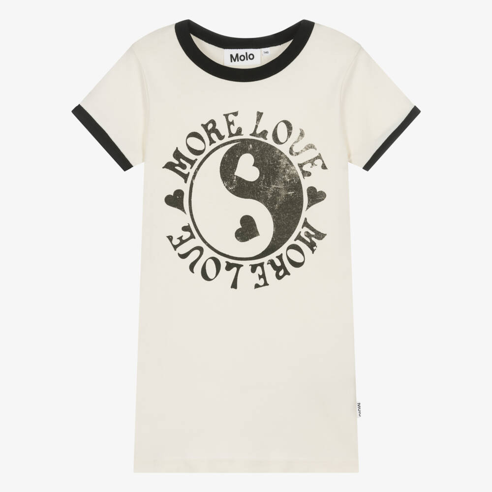 Teen girls ivory short-sleeved jersey T-shirt, designed by Molo with a black crew neck trim. Cool and spirited, it has a 'More Love' slogan printed around a peace symbol graphic in a faded effect. It has a close-fitting style and is made from sustainable organic cotton.