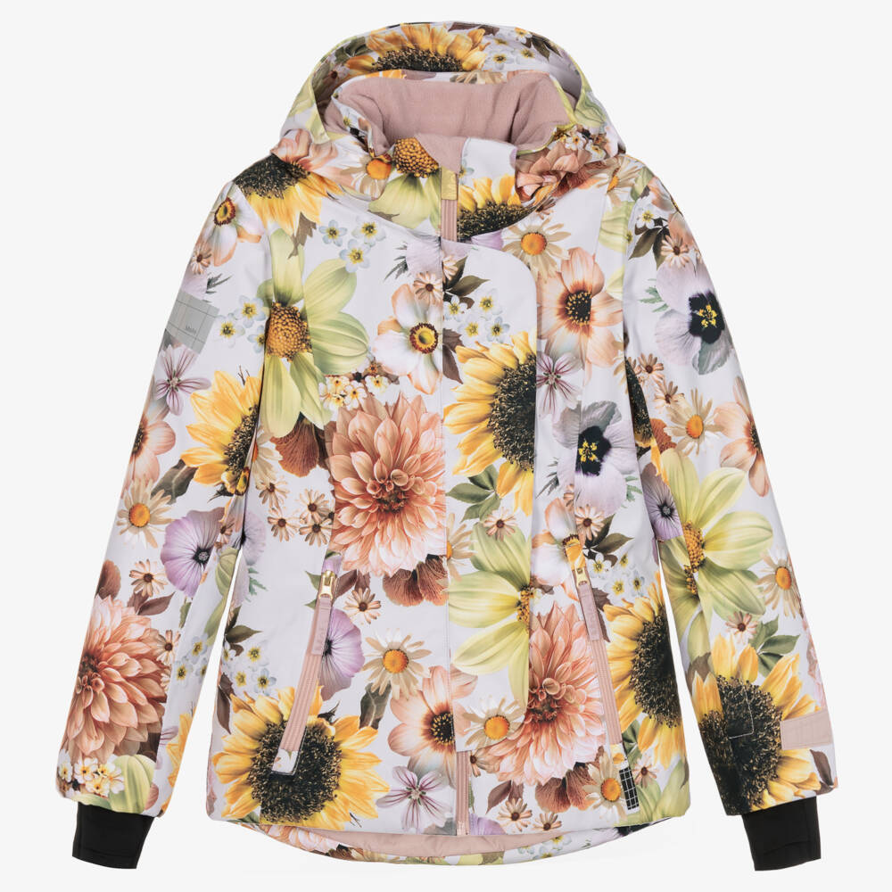 Pink floral ski jacket for teen girls by Molo, made from recycled, PFC-free materials. Warmly padded, this stylish jacket is breathable, windproof and waterproof. It is lined in cosy polar fleece with mesh inserts and has a detachable hood that secures with velcro. To keep out the snow, it has an elasticated skirt that fastens with poppers at the front. The stretchy internal cuffs with thumb holes and storm flap over the front zip help to keep out chilly winds. There are zipped front pockets and a zipped ski pass pocket on one sleeve, with reflective logo prints for brand recognition and increased visibility.