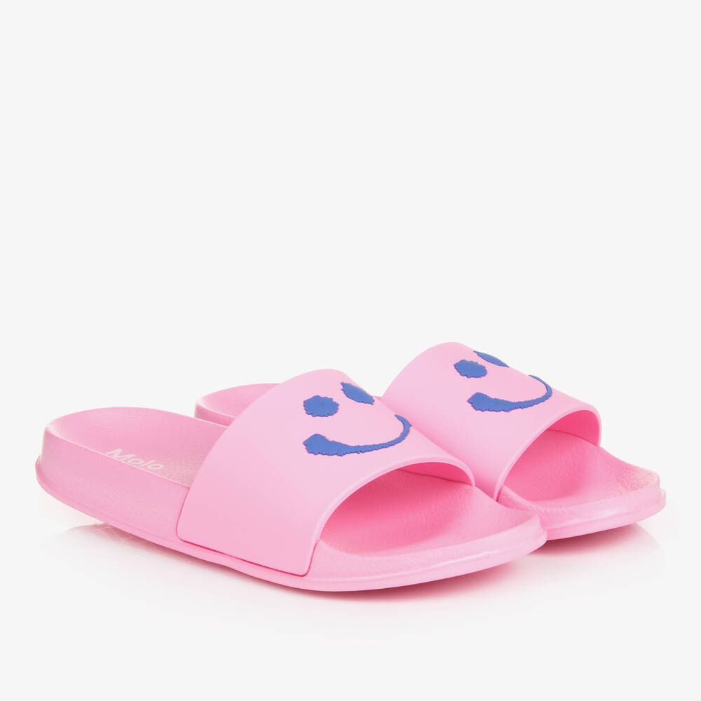 A cool look for the poolside, beach or resort, these pink sliders for teen girls are from Danish designer, Molo. A distinctive style, they are detailed with a purple smiling face motif on the rubber strap and a logo print on the textured insole. Created with a moulded footbed for comfort, these waterproof sandals have a textured outer sole.