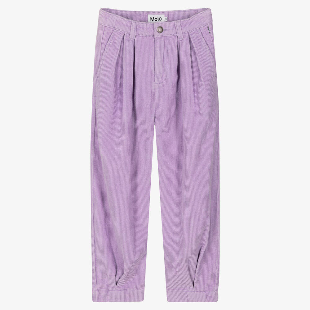 Add flair to an outfit in these lilac purple corduroy trousers, designed by Molo for teen girls. Subtly placed on the hip is a logo tab, which is further accented by a branded popper fastening for added cool. These extra relaxed fit cotton trousers come in a high-waisted style, fitting wide at the leg and tapered at the ankle. Zipping-up usefully at the front, they are finished with side seam pockets, neat pleated darts and faux back pockets.