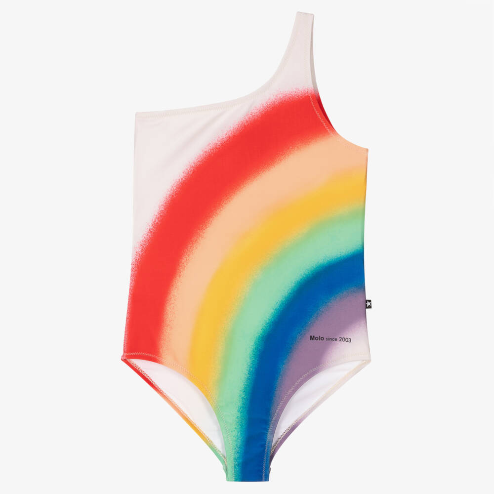 Teen girls will stand out in this colourful one-shoulder swimsuit by Danish brand Molo. Bring on vibrant shades and cheerful vibes with spray paint rainbow prints across the front and back. There is a 'Molo since 2003' logo printed on the side to mark the brand's twenty years jubilee. Silky smooth and fully lined, this UPF50+ swimsuit is made using recycled fibres for a positive eco-impact.