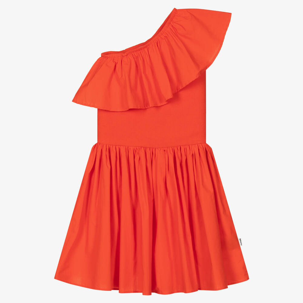 Stylish asymmetric red dress for teen girls by Danish brand Molo, made with organic cotton. Chic yet comfortable to wear, it has a soft ribbed jersey bodice with a statement poplin ruffle around the neckline and over one shoulder. The gathered poplin skirt gives a feminine silhouette and there is a branded tab on the side seam for a discreet designer finish.