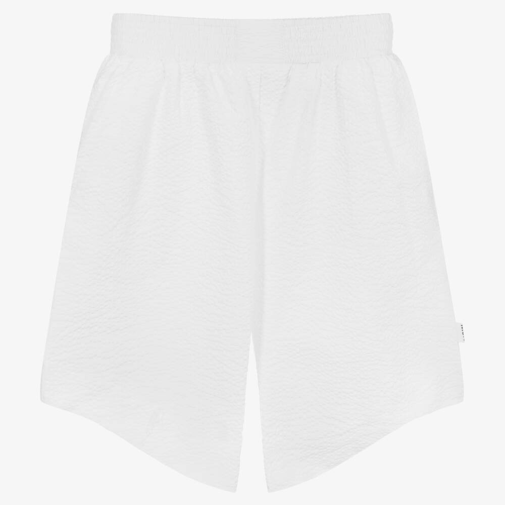 Casual and comfy for teen girls, these cotton seersucker shorts are by Molo. Knee length and in a wide leg style, they have an elasticated waist for easy pull on, with useful pockets at the hips. The curved hems are higher at the sides, and there is a branded tab for a designer touch.