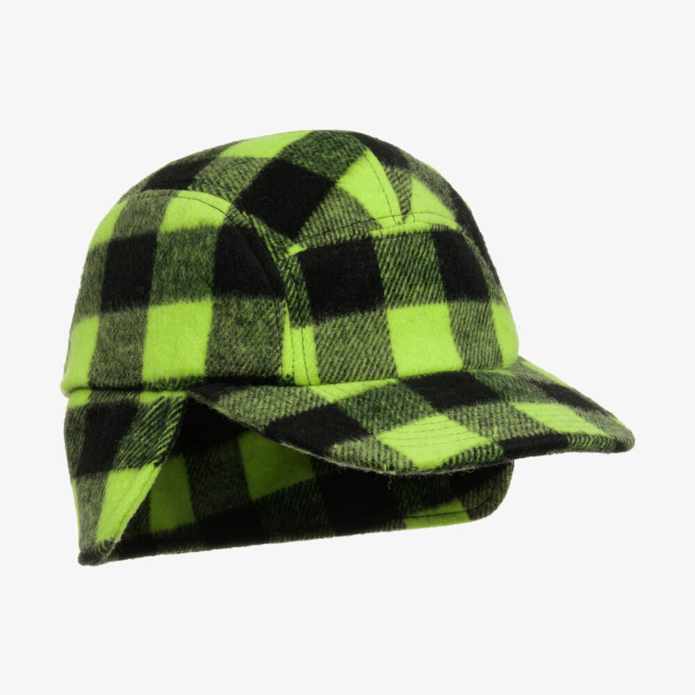 Cool for teen boys and girls on casual days, this green and black trapper hat is from Molo. It has a classic check design with a subtle grid logo tab featured on the side. Made from a brushed wool blend, the structured peak and back flap will protect them from wind or sunshine.