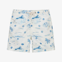 Younger boys blue, red,and white camouflage print swim shorts by luxury designer Moncler Enfant, with a floral and paisley pattern. Soft and lightweight, these fun shorts are inspired by the adult collection and have the brand's signature logo patch appliquéd on the back pocket, which also secures with a single branded popper for added designer appeal. There are two side pockets and a gently elasticated waistband ideal for little tummies. Ideal for the beach or pool, they have a lightweight jersey lining for added comfort.