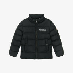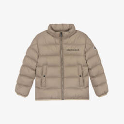 Beige padded jacket for boys by Moncler Enfant, offering both warmth and style. The smooth exterior is complemented by a cosy down filling and a pack-away hood, in contrasting navy blue, for added versatility. The jacket features a branded zip fastening, front pockets, and signature logo detailing for a designer finish.