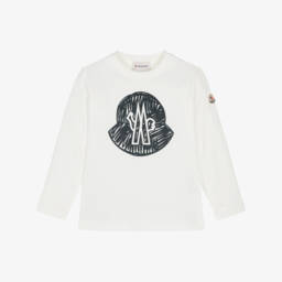 Ivory long-sleeved top for boys by luxury designer Moncler Enfant, made in soft organic cotton jersey. This casual style features a chest pocket with a rubberised black logo and branded popper detailing in shiny silver. Moncler's signature felt logo patch is on one sleeve.