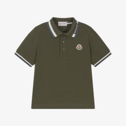 Khaki green polo shirt for boys by luxury Italian label Moncler Enfant, combining classic style with modern flair. Made in soft cotton piqué, it has contrasting blue and white striped trims, with jacquard branding on the collar and the iconic felted logo badge on the chest.