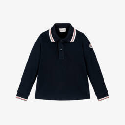 Navy blue cotton piqué long-sleeved polo shirt for boys by Moncler Enfant, featuring the luxury brand's signature navy blue, red and white striped detailing. This casual top has branded popper fastenings and a felted logo on one sleeve for instant brand recognition.