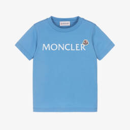 Navy blue T-shirt for boys by luxury brand Moncler Enfant. For designer appeal, it has an orange logo printed across the front, with the iconic felt logo patch on one sleeve. Made in soft cotton jersey, this casual tee has short sleeves and a ribbed crew neckline.