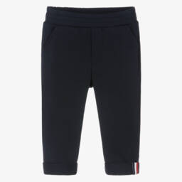 Little boys white and black joggers from luxury designer Moncler Enfant. This monochromatic design is crafted in stretchy, mid-weight cotton jersey with softly ribbed cuffs. They have black and white asymmetric front panels with split rubber logo lettering. The French label's logo tab is stitched on the back below the comfortable elasticated waist.