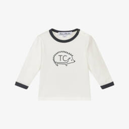 Boys white cotton long sleeved logo top by luxury brand Moncler Enfant, printed with a colourful logo print on the chest. Made in soft, comfortable cotton jersey, this casual top has a small crew neckline and useful branded popper fastenings on one shoulder. The brand's signature logo patch is appliquéd on one sleeve, for an added designer touch.