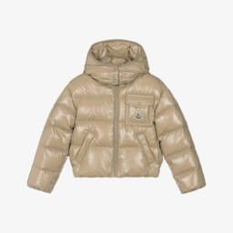 Beige trousers for girls by luxury label Moncler Enfant, woven in soft cotton twill. Ideal for smart casual wear, they have stylish pleats on the front and slanted front pockets. There is an adjustable waist for an ideal fit, with a zip and branded popper for fastening. The brand's iconic felted logo on the back adds a signature finish.