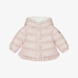 A coral pink puffer jacket for little girls by luxury brand, Moncler Enfant, with a pretty ruffle hem. Down-padded for excellent warmth, it has soft jersey lining for comfort and elasticated cuffs to keep out cold chills. It fastens with a zip underneath the branded popper fastening placket, and the iconic felt logo patch can be seen on one sleeve.