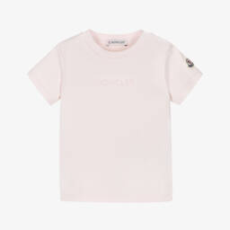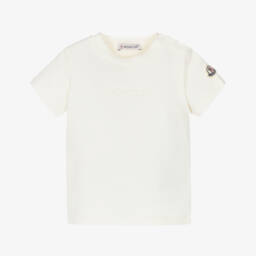 An ivory cotton T-shirt for little girls by luxury brand Moncler Enfant, with a tonal embroidered logo on the front. This casual tee has a crew neckline and popper fastenings on one shoulder to help with dressing. The designer's iconic felted logo on one sleeve adds a signature finish.