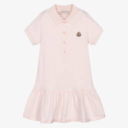 This pale pink polo dress by Moncler Enfant combines casual style with a touch of elegance. Made in soft cotton piqué, it features a classic polo collar, short sleeves with ribbed cuffs, and a charming gathered skirt. The iconic felt logo patch is sewn on the chest for a signature finish.