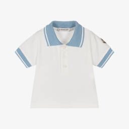 Cute white and pink striped polo shirt for little girls, by luxury designer Moncler Enfant. Made in soft cotton jersey, it has pink knitted logo trims on the sleeves, and a pointed ribbed collar.