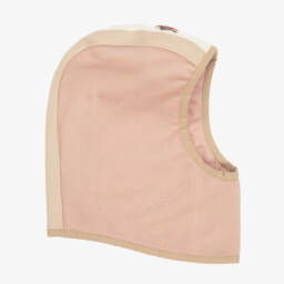 Pink balaclava for little girls by luxury French brand Moncler Enfant, with an ivory jacquard logo. Cosy and comfortable, it is knitted in beautifully soft virgin wool and fastens with poppers on the gently ribbed neck.