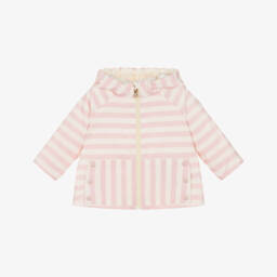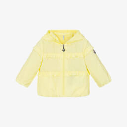 White button-up raincoat for little girls by luxury French brand Moncler Enfant, made in soft, shiny polyester. Lined in soft jersey, it has a detachable hood with front pockets and a navy blue, red and white logo patch on the chest.