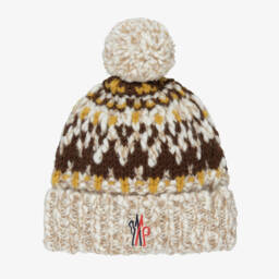 Purple, green and black hat for boys and girls by Moncler Enfant, knitted in soft and luxurious, chunky virgin wool. Warm and cosy, it has a colourful Nordic Fair Isle pattern and there is a large black bobble on the top. The wide, ribbed, turned-up brim is black and has the brand's signature logo patch on the front and a black logo tab on the back.