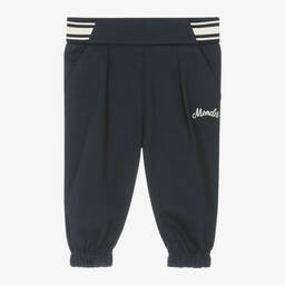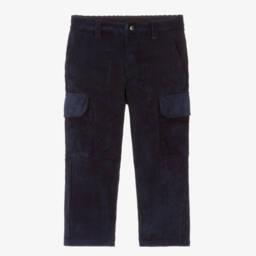 Smart-casual navy blue trousers for teen boys by luxury brand Moncler Enfant, with the brand's signature felt logo badge on the back. These stylish cargo-style trousers have front and back pockets as well as classic popper-fastening pockets on the sides of the legs. Made in soft corduroy, they fasten with a popper and zip and have red, white and blue striped detailing on the back of the waistband for a smart designer finish.