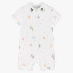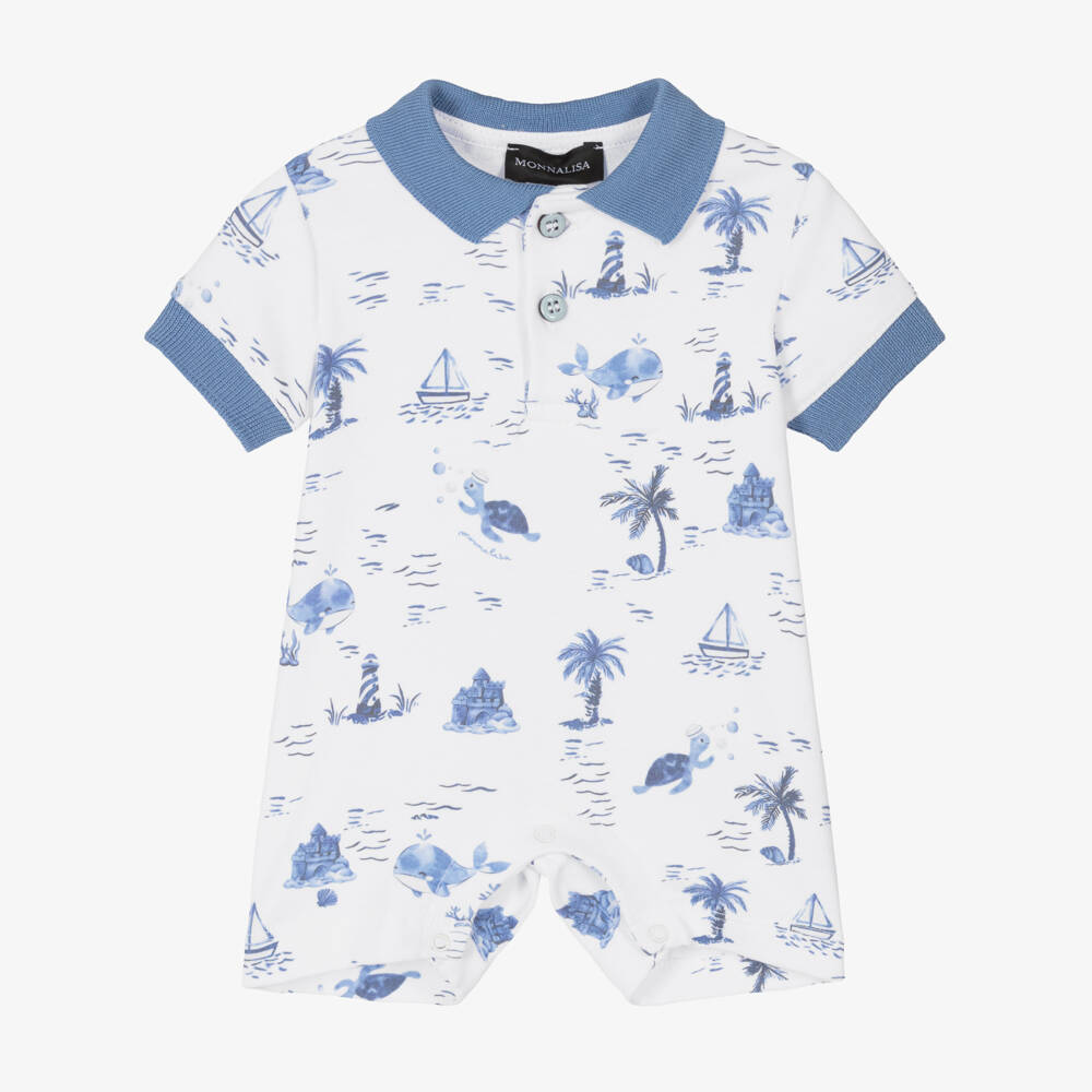 Cute white shortie for baby boys by Monnalisa, made in soft cotton jersey. Printed with a blue, ocean-themed pattern, this one piece has a ribbed, pointed collar and matching cuffs. For easy dressing, it has useful poppers between the legs. Glossy buttons on the chest complete the babysuit with a smart finish.