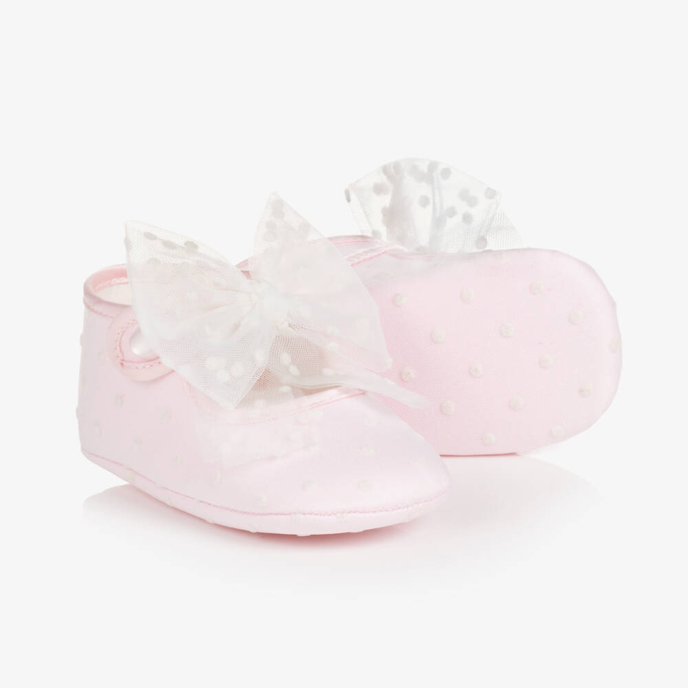 Cute pale pink pre-walker shoes for baby girls from Italian brand Monnalisa. Soft and flexible, they are made in satin with a lightweight tulle overlay. They have a soft cotton insole for added comfort. The foot strap is decorated with a spotted tulle bow and fastens with a pearlescent button fastening.