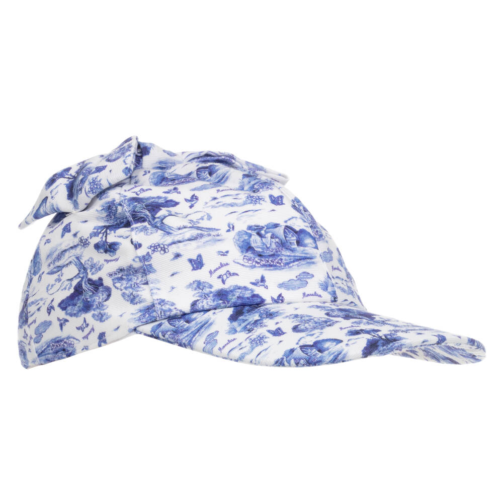 A white and blue cotton cap for girls by Monnalisa, with a lovely toile de Jouy print. It has a pretty bow on the top, with an elasticated strap at the back.