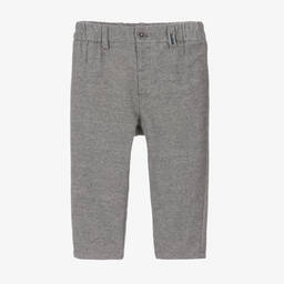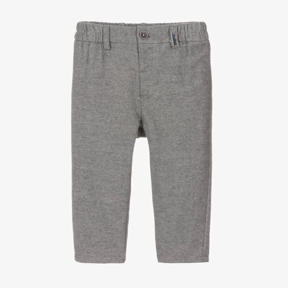 Grey cotton trousers for younger boys by Monnalisa, with a subtle diagonal pinstripe design. Wonderfully soft, these smart trousers are elasticated on the back for a comfortable fit and fasten with a button on the front. The brand's metal logo plate is stitched on one of the belt loops for a subtle designer touch.