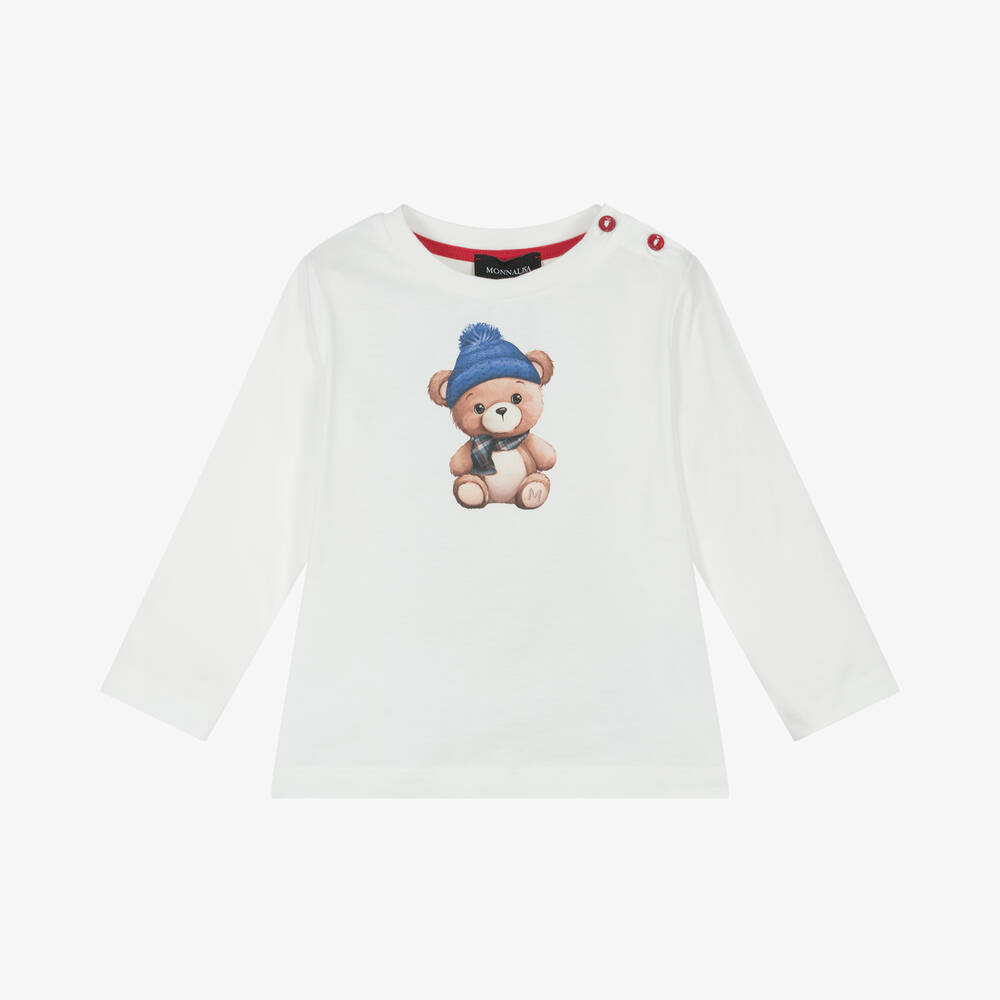 A long-sleeved cotton top for little boys by Italian brand Monnalisa. This ivory top has a cute bear print on the front and back, wearing a blue pom-pom hat and a checked scarf. It has a simple round neckline and red button fastenings on one shoulder.