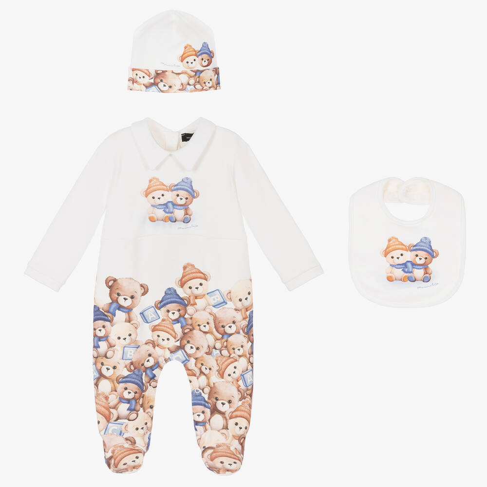 From Monnalisa, an ivory cotton babysuit set for boys. All three soft jersey pieces are printed with adorable teddy bears for a coordinated look. Easy-to-use popper fastenings on the babygrow and towelling lined bib make dressing stress-free.
