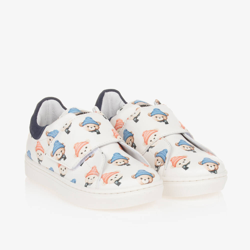 White trainers for little boys from Italian designer Monnalisa, made in soft faux leather. These adorable shoes are patterned with pale beige teddy bears wearing blue and red pom-pom hats. They have a rubber logo patch on the tongue and a navy blue faux suede heel panel for an interesting mix of textures. The leather lining and insole provides comfort, the easy-fastening velcro straps help pull the shoes on easily, and the rubber sole is non-slip for safety.