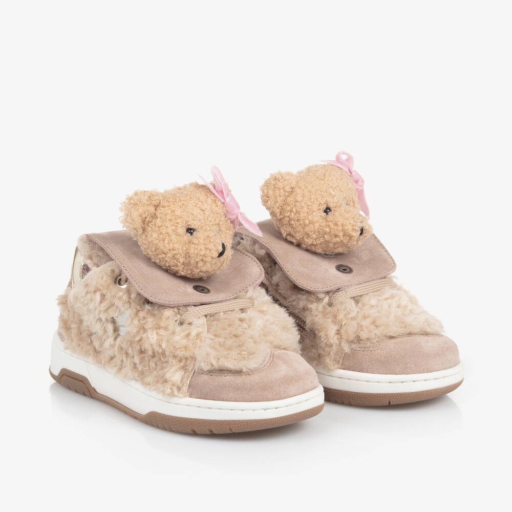 Super cute trainers for girls by Monnalisa, with a teddy bear on the front flap, wearing a pink velvet bow. Made in soft, fluffy beige teddy fleece, they have dusky pink suede leather toes and heels, with a shiny, metallic gold trim on the ankles. Lined in soft, supple pink leather, with a cushioned insole, they fasten with a side zip and velcro strap over, as well as having laces on top. There is a non-slip, rubber sole and a heart-shaped, branded charm on the sides, adding a designer finish.