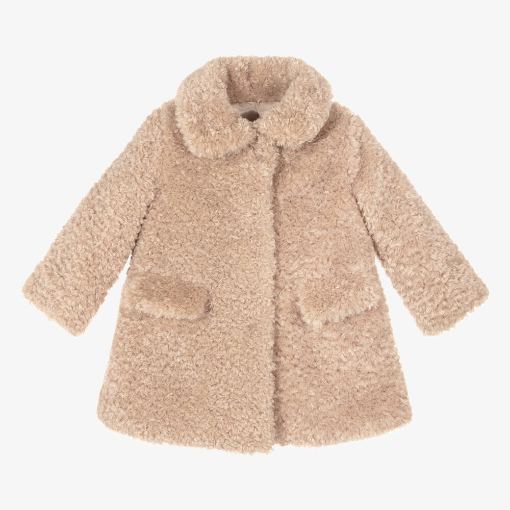 A gorgeous beige coat for little girls by Monnalisa, made in beautifully soft teddy fleece. Lined in silky satin for a luxurious feel, it has useful flap pockets on the front and large concealed poppers for quick fastening.