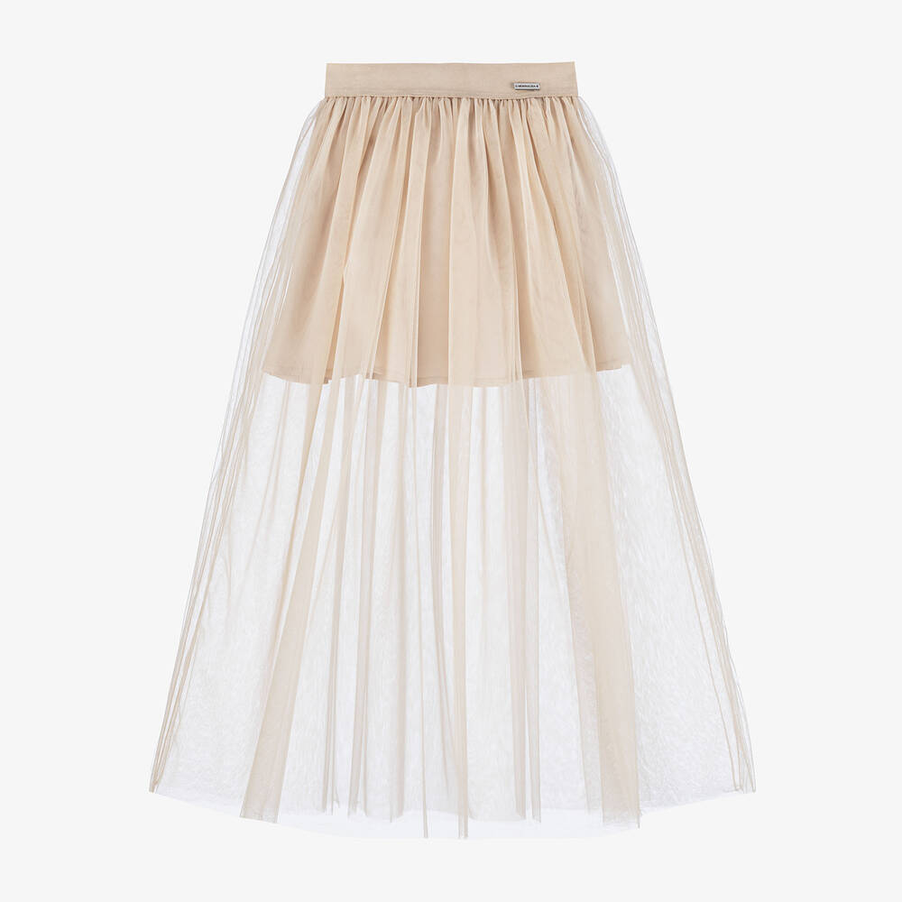 A stylish maxi-length beige skirt for girls by Monnalisa, made in soft tulle. Designed with an element of fun, it has a short underskirt, made in silky lightweight fabric. The waistband is elasticated for comfort and easy pull on, with a silver metal logo plate adding a signature finish.
