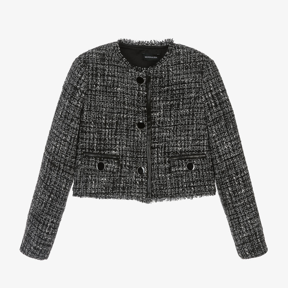 A black and ivory jacket for girls by Italian designer Monnalisa, made in cotton blend. Effortlessly elegant and stylish, this bouclé tweed jacket has shiny metal buttons on the front, faux leather trims, and fringed edges. Styled in a slightly cropped fit, it has faux front pockets and a logo-jacquard satin lining.