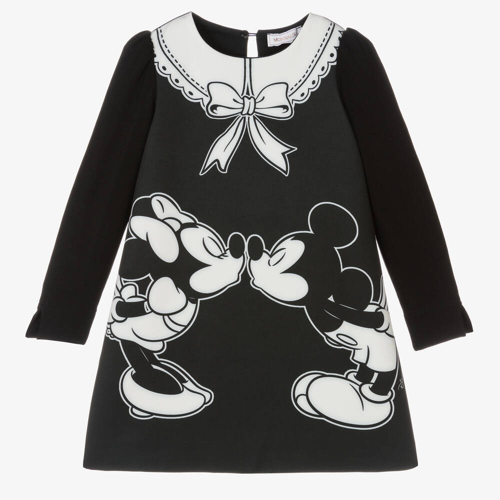 From Monnalisa, a sweet black A-line dress for girls. This monochromatic design features a cute Mickey and Minnie Mouse design with a printed 'collar' and bow on the front in white. Stretchy and comfortable, the body is made in smooth, mid-weight fabric with soft viscose-blend sleeves and a cotton and viscose twill lining. The long sleeves have elegant split details on the cuffs and there is a single button fastening on the back.