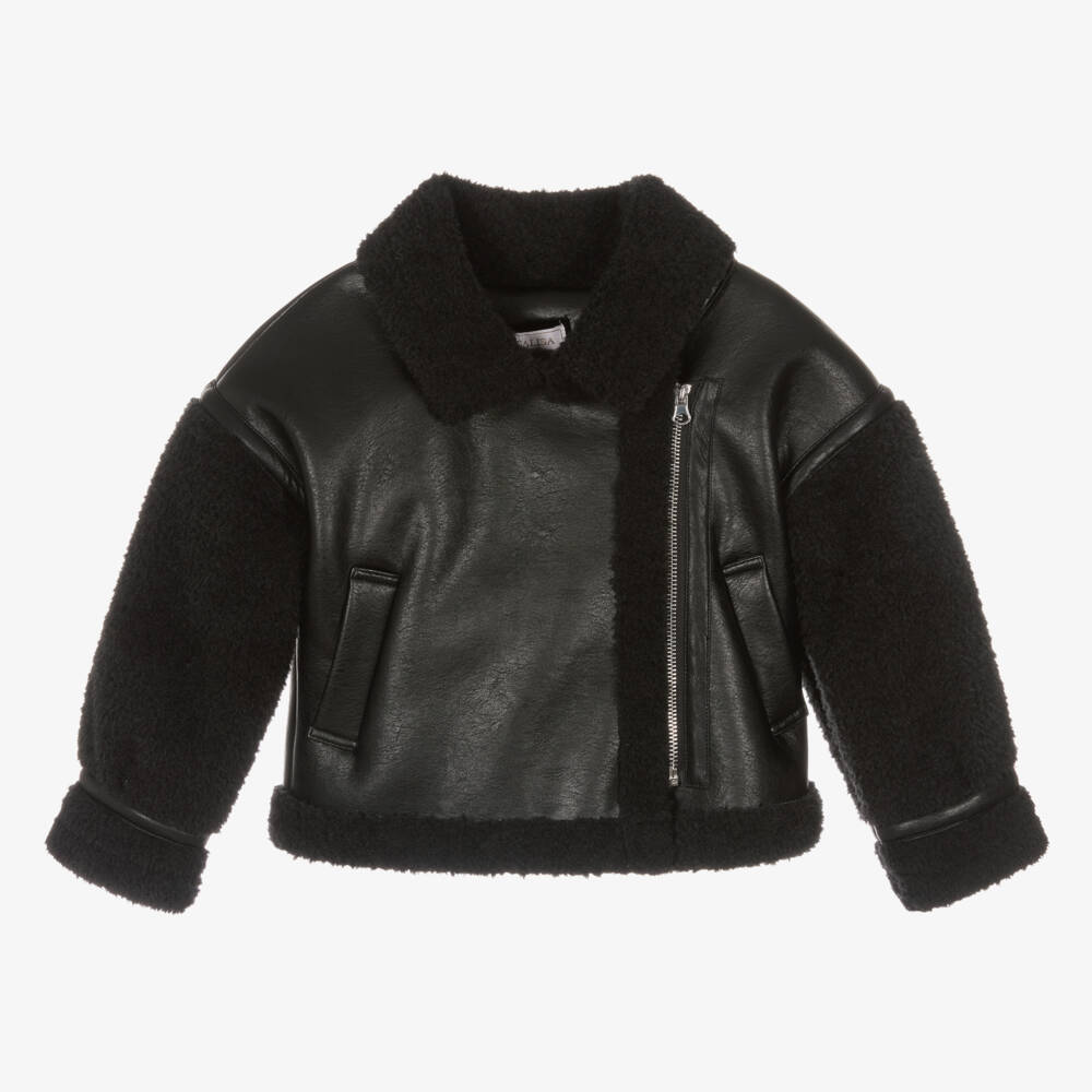 An effortlessly on-trend black aviator jacket for girls, by Italian luxury brand Monnalisa. Made in soft faux leather with cosy faux sheepskin trims, it has a snuggly fleece lining for ultimate warmth and a shiny silver zip fastening on the front. Layer over your child's looks for a cool style.