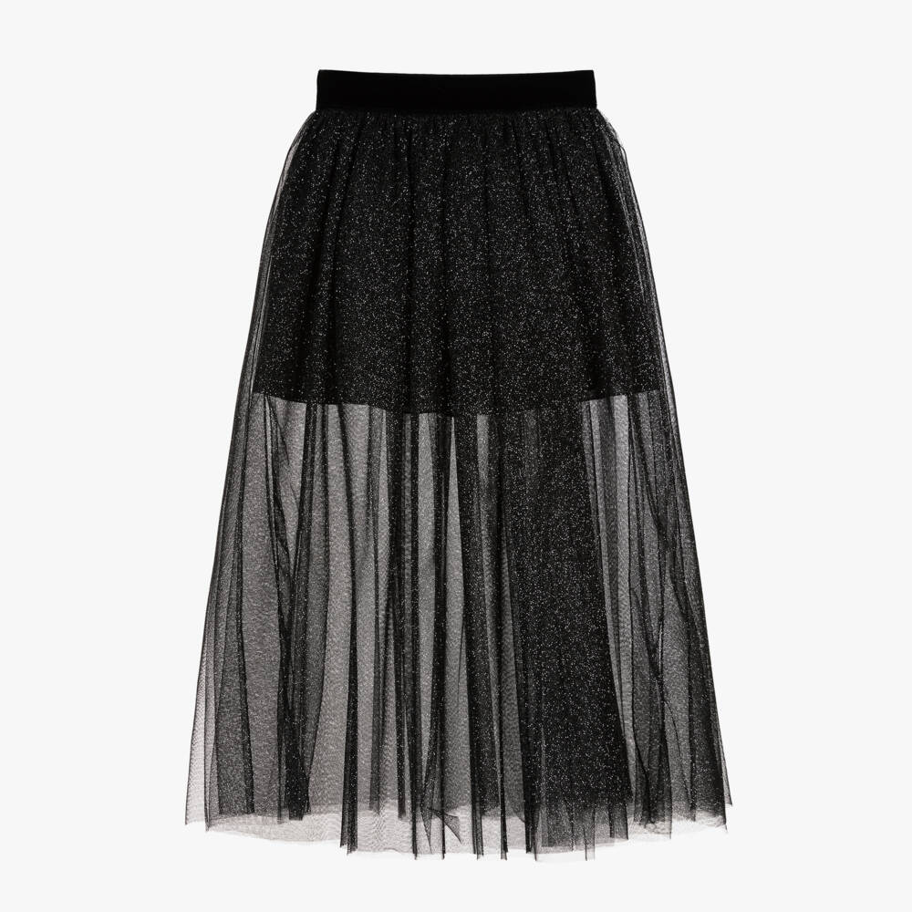 Lovely for parties, a sparkling black tulle skirt for girls by Monnalisa. This stunning full length design has an eye-catching glittery silver top layer, with layers of sheer tulle underneath. It gathers gently around the elasticated velvet waistband, and has a long side split for an elegant finish. Visible below the tulle layers is a short length skirt, made in a soft viscose-cotton blend for comfort.