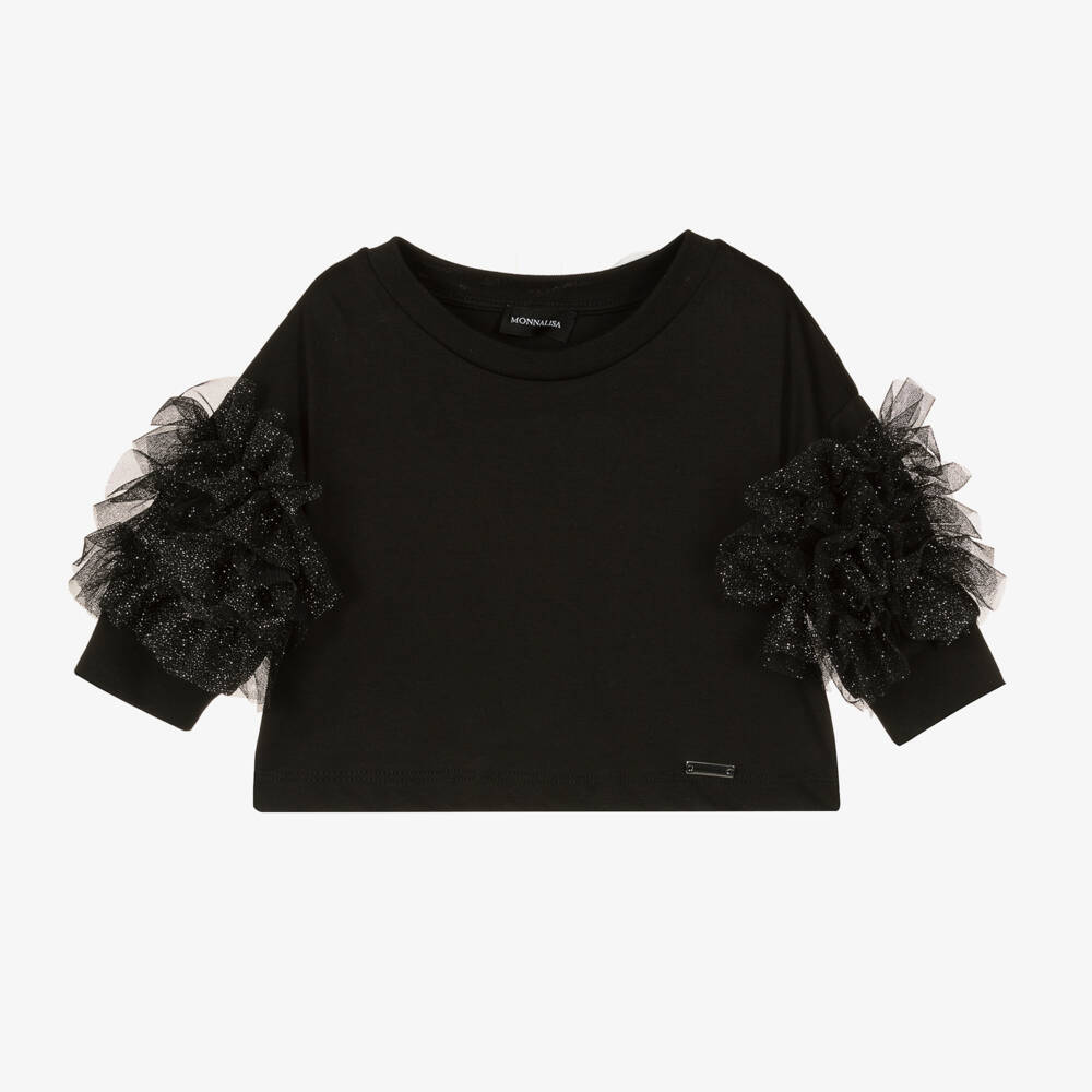 A black top for girls by Italian brand Monnalisa, made from soft cotton jersey. Designed to sit just below the waist, this boxy top has glittery tulle trims on the sleeves and a silver metal logo tab above the hem. It has quarter-length sleeves and lightly ribbed trims for comfortable wear.