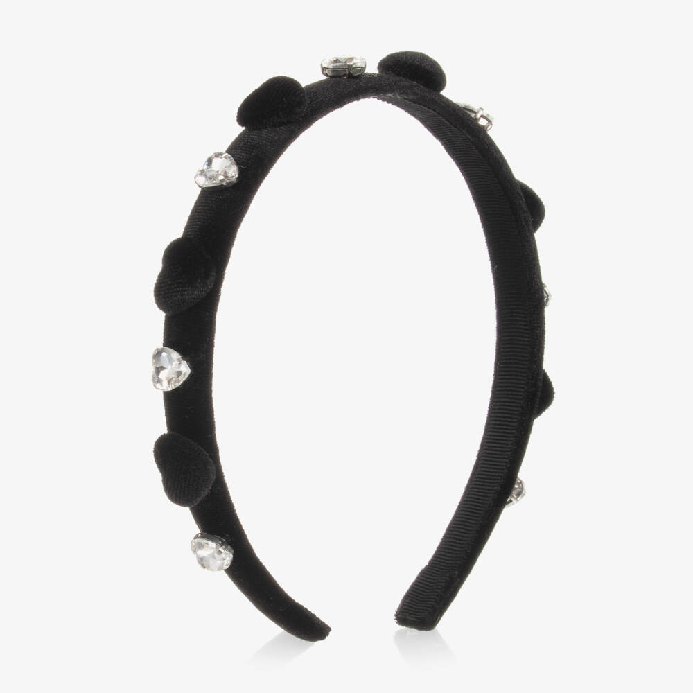 A lovely black hairband for girls by Italian brand Monnalisa. The velvet-covered band is decorated with cute velvety hearts and heart-shaped diamanté for a touch of sparkle.