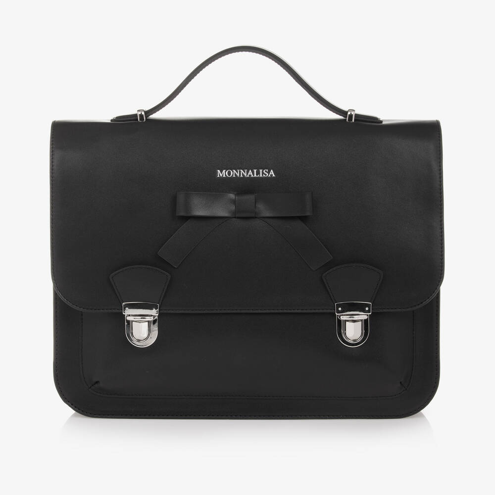 A smart black leather blend satchel for girls by Italian brand Monnalisa, with shiny silver metal hardware. Sturdy and structured, this briefcase style bag has a zipped main compartment with internal zip pocket and a large slip pocket for easy organisation. The front flap fastens with two press clasps and has a pretty bow with a silver embossed logo above. Ideal for use as a school bag, it comes with two detachable and adjustable straps so it can be worn as a backpack.