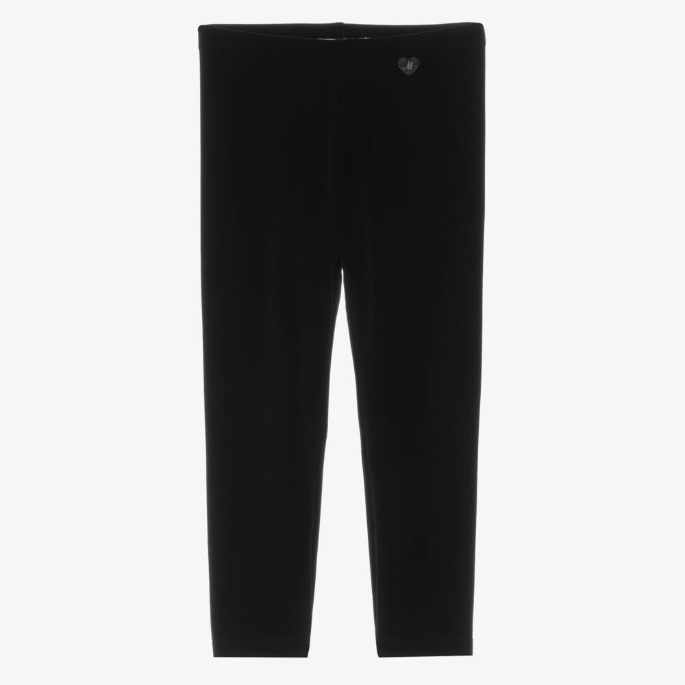 Girls stylish black leggings by Monnalisa, made in beautifully soft velour. This versatile, full-length style has a heart shaped logo charm sewn below the elasticated waist, making them ideal for comfortable, yet cute looks.