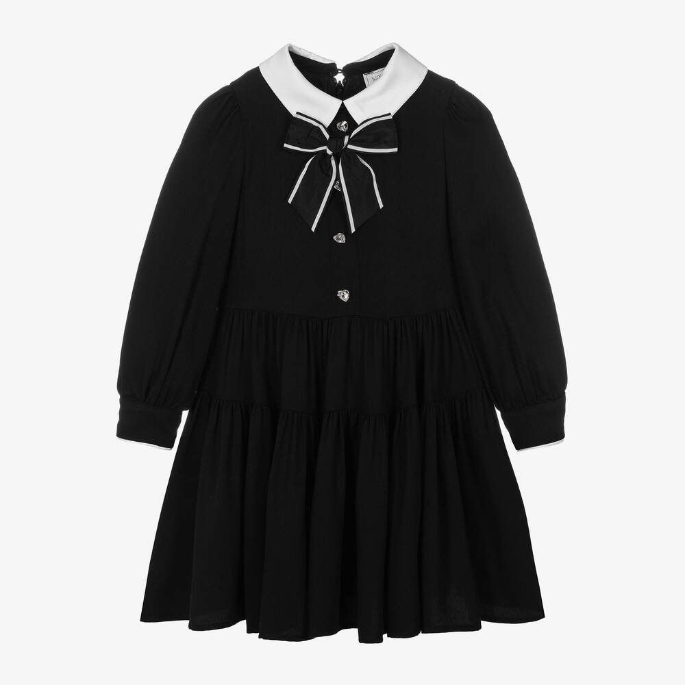 Girls black dress by Italian designer Monnalisa, made in soft viscose for comfortable wear. Classically styled with a contrasting white collar, this timeless design has puffed long sleeves and a gathered full skirt. The bodice is decorated with sparkling crystal buttons and a grosgrain ribbon bow that secures to the front with buttons. For a neat finish, it fastens on the back with a concealed zip and button.